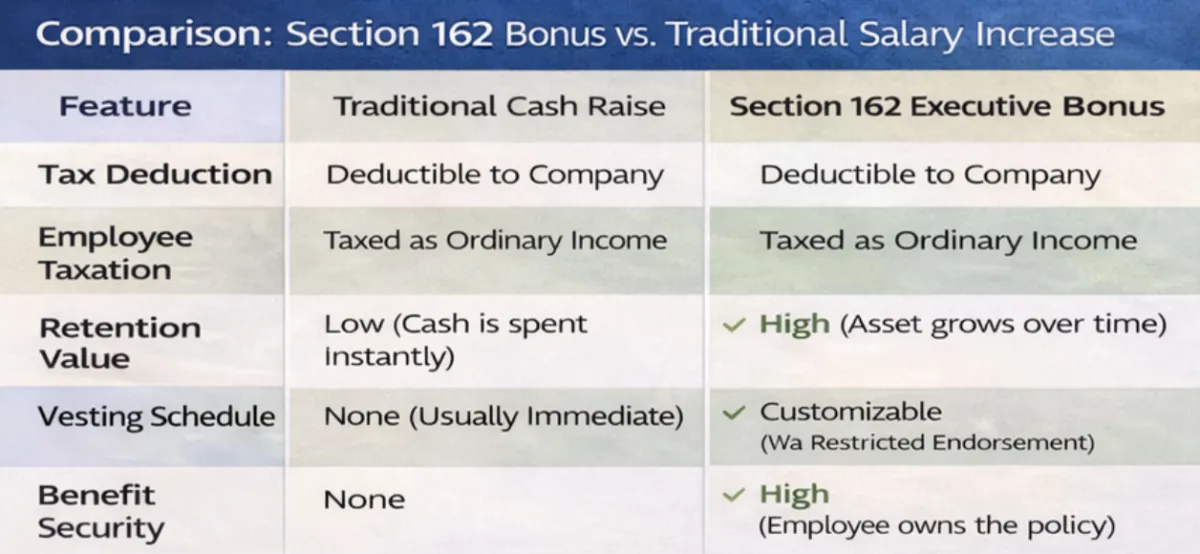 A Section 162 Executive Bonus Plan is a non-qualified strategy where a company pays the premium on a life insurance policy owned by a key executive. The company deducts the the premium as a business expense (compensation), and the executive gains a portable, tax-advantaged asset.